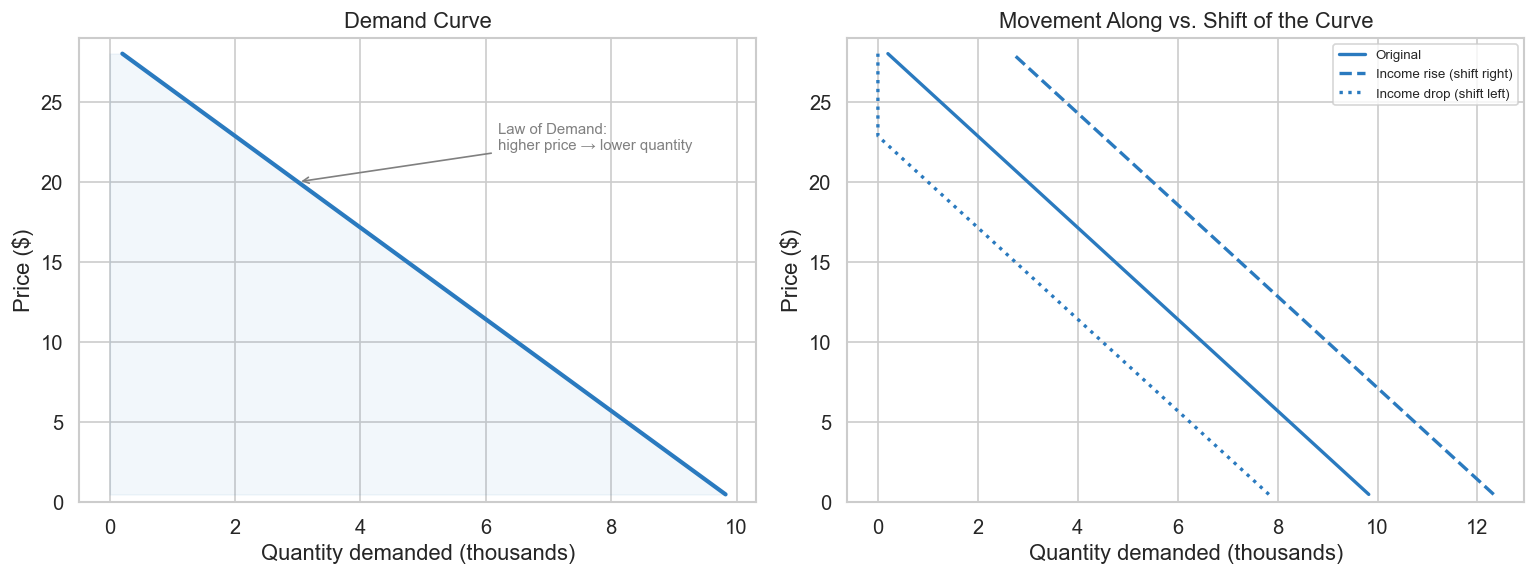 ## 1.1a The Demand Curve# Linear demand: Q = a - b*p (pedagogical — elasticity varies along this curve)a_d, b_d =10_000, 350def demand(p, a=a_d, b=b_d):return np.maximum(a - b * p, 0)prices = np.linspace(0.5, 28, 300)fig, axes = plt.subplots(1, 2, figsize=(13, 5))# Panel 1: Demand curve (price on Y-axis, quantity on X-axis — econ convention)ax = axes[0]Q_vals = demand(prices)ax.plot(Q_vals /1_000, prices, color="#2a7abf", lw=2.5)ax.fill_betweenx(prices, Q_vals /1_000, alpha=0.06, color="#2a7abf")ax.set_ylabel("Price ($)")ax.set_xlabel("Quantity demanded (thousands)")ax.set_title("Demand Curve")ax.annotate("Law of Demand:\nhigher price → lower quantity", xy=(demand(20)/1000, 20), xytext=(demand(8)/1000-1, 22), arrowprops=dict(arrowstyle="->", color="gray"), fontsize=9, color="gray")ax.set_ylim(0, 29)# Panel 2: Shift of demand curve (income increase shifts right)ax = axes[1]for a_shift, label, ls in [(a_d, "Original", "-"), (a_d +2500, "Income rise (shift right)", "--"), (a_d -2000, "Income drop (shift left)", ":")]: Q_s = demand(prices, a=a_shift) ax.plot(Q_s /1_000, prices, color="#2a7abf", lw=2, linestyle=ls, label=label)ax.set_ylabel("Price ($)")ax.set_xlabel("Quantity demanded (thousands)")ax.set_title("Movement Along vs. Shift of the Curve")ax.legend(fontsize=8)ax.set_ylim(0, 29)plt.tight_layout()plt.savefig("fig_01_demand.png", dpi=130, bbox_inches="tight")plt.show()print("Left: demand slopes down (law of demand). Price on Y-axis per econ convention.")print("Right: income changes SHIFT the curve; price changes move you ALONG it.")