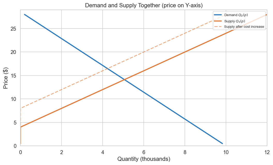 ## 1.2a The Supply Curve# Linear supply: Q_S = c + d*p (upward sloping)c_s, d_s =-2_000, 500def supply(p, c=c_s, d=d_s):return np.maximum(c + d * p, 0)fig, ax = plt.subplots(figsize=(9, 5.5))# Price on Y-axis, Quantity on X-axisax.plot(demand(prices) /1_000, prices, color="#2a7abf", lw=2.5, label="Demand $Q_D(p)$")ax.plot(supply(prices) /1_000, prices, color="#e07b39", lw=2.5, label="Supply $Q_S(p)$")# Shift: input cost increase shifts supply leftax.plot(supply(prices, c=-4_000) /1_000, prices, color="#e07b39", lw=2, linestyle="--", alpha=0.6, label="Supply after cost increase")ax.set_ylabel("Price ($)")ax.set_xlabel("Quantity (thousands)")ax.set_title("Demand and Supply Together (price on Y-axis)")ax.legend(fontsize=8, loc="upper right")ax.set_ylim(0, 29)ax.set_xlim(0, 12)plt.tight_layout()plt.savefig("fig_02_supply.png", dpi=130, bbox_inches="tight")plt.show()