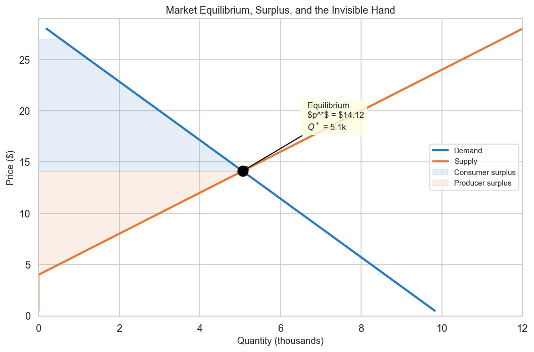 ## 1.3a Market Equilibrium# Analytical equilibrium: a - b*p = c + d*p → p* = (a - c) / (b + d)p_star = (a_d - c_s) / (b_d + d_s)q_star = demand(p_star)fig, ax = plt.subplots(figsize=(9, 6))# Price on Y, Quantity on XQ_d = demand(prices)Q_s = supply(prices)ax.plot(Q_d /1_000, prices, color="#2a7abf", lw=2.5, label="Demand")ax.plot(Q_s /1_000, prices, color="#e07b39", lw=2.5, label="Supply")# Equilibrium pointax.scatter([q_star /1_000], [p_star], s=150, color="black", zorder=5)ax.annotate(f" Equilibrium\n $p^*$ = ${p_star:.2f}\n $Q^*$ = {q_star/1000:.1f}k", xy=(q_star /1_000, p_star), xytext=(q_star /1_000+1.5, p_star +4), arrowprops=dict(arrowstyle="->", color="black", lw=1.3), fontsize=10, bbox=dict(boxstyle="round,pad=0.3", fc="lightyellow", alpha=0.8))# Consumer surplus: area between demand and p* (to the LEFT of equilibrium on this axis layout)p_cs = np.linspace(p_star, 27, 100)Q_cs = demand(p_cs)ax.fill_betweenx(p_cs, Q_cs /1_000, 0, where=Q_cs >0, alpha=0.12, color="#2a7abf", label="Consumer surplus")# Producer surplus: area between p* and supply curvep_ps = np.linspace(c_s / d_s *-1+0.1, p_star, 100) # supply > 0 rangeQ_ps = supply(p_ps)ax.fill_betweenx(p_ps, Q_ps /1_000, 0, where=Q_ps >0, alpha=0.12, color="#e07b39", label="Producer surplus")ax.set_ylabel("Price ($)", fontsize=11)ax.set_xlabel("Quantity (thousands)", fontsize=11)ax.set_title("Market Equilibrium, Surplus, and the Invisible Hand", fontsize=12)ax.legend(fontsize=9)ax.set_ylim(0, 29)ax.set_xlim(0, 12)plt.tight_layout()plt.savefig("fig_03_equilibrium.png", dpi=130, bbox_inches="tight")plt.show()print(f"Equilibrium price : ${p_star:.2f}")print(f"Equilibrium quantity : {q_star:,.0f} units")print(f"\nConsumer surplus: the area between demand and the equilibrium price —")print(f"the total 'bargain' consumers capture by paying less than their max willingness.")print(f"Producer surplus: the corresponding gain for firms.")print(f"Together they measure total market welfare — what Smith's invisible hand delivers.")