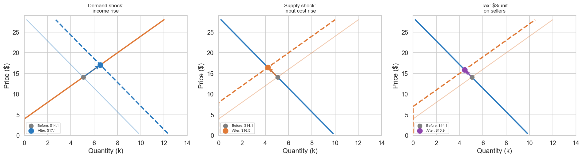 ## 1.4a Comparative Statics: Three Shocksfig, axes = plt.subplots(1, 3, figsize=(16, 4.5))def find_eq(a, b, c, d): p = (a - c) / (b + d) q =max(a - b * p, 0)return p, qshocks = [ ("Demand shock:\nincome rise", (a_d, b_d, c_s, d_s), (a_d +2500, b_d, c_s, d_s),"#2a7abf"), ("Supply shock:\ninput cost rise", (a_d, b_d, c_s, d_s), (a_d, b_d, c_s -2000, d_s),"#e07b39"), ("Tax: $3/unit\non sellers", (a_d, b_d, c_s, d_s), (a_d, b_d, c_s -3* d_s, d_s),"#8e44ad"),]for ax, (title, before, after, color) inzip(axes, shocks): a0, b0, c0, d0 = before a1, b1, c1, d1 = after p0, q0 = find_eq(*before) p1, q1 = find_eq(*after)# Price on Y, Quantity on X Q_d0 = np.maximum(a0 - b0 * prices, 0) Q_s0 = np.maximum(c0 + d0 * prices, 0) Q_d1 = np.maximum(a1 - b1 * prices, 0) Q_s1 = np.maximum(c1 + d1 * prices, 0) ax.plot(Q_d0/1000, prices, color="#2a7abf", lw=1.5, alpha=0.4) ax.plot(Q_s0/1000, prices, color="#e07b39", lw=1.5, alpha=0.4) ax.plot(Q_d1/1000, prices, color="#2a7abf", lw=2.5, linestyle="--"if a1!=a0 else"-") ax.plot(Q_s1/1000, prices, color="#e07b39", lw=2.5, linestyle="--"if c1!=c0 else"-") ax.scatter([q0/1000], [p0], s=70, color="gray", zorder=5, label=f"Before: ${p0:.1f}") ax.scatter([q1/1000], [p1], s=100, color=color, zorder=5, label=f"After: ${p1:.1f}") ax.annotate("", xy=(q1/1000, p1), xytext=(q0/1000, p0), arrowprops=dict(arrowstyle="->", color=color, lw=2)) ax.set_ylabel("Price ($)") ax.set_xlabel("Quantity (k)") ax.set_title(title, fontsize=10) ax.legend(fontsize=7) ax.set_ylim(0, 29) ax.set_xlim(0, 14)plt.tight_layout()plt.savefig("fig_04_shocks.png", dpi=130, bbox_inches="tight")plt.show()print("Each shock moves the equilibrium to a new point on both curves.")print("At the new point, elasticity differs, optimal pricing differs,")print("and the feedback loop carries the adjustment forward into the next period.")
