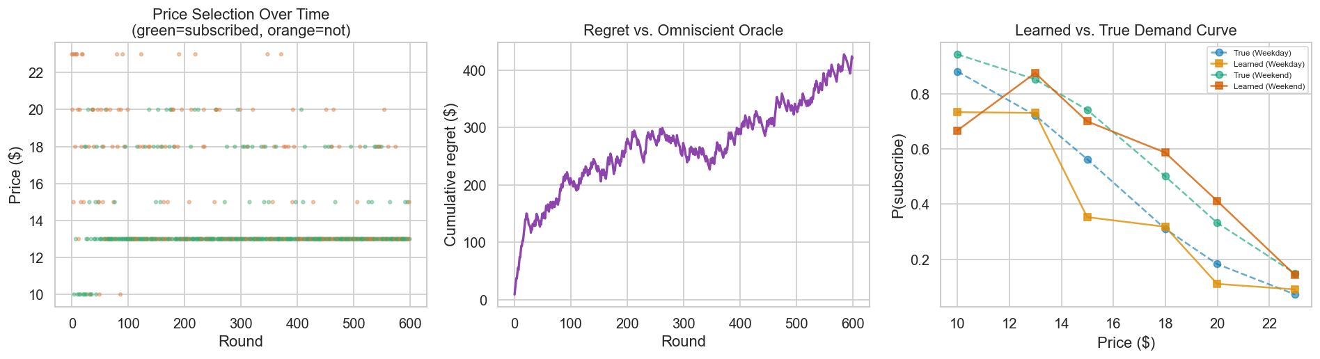 Reflection: evaluating the outcome. Did the forecast match reality? Was the bandit’s regret trajectory consistent with the estimated demand curve? If not, what went wrong?