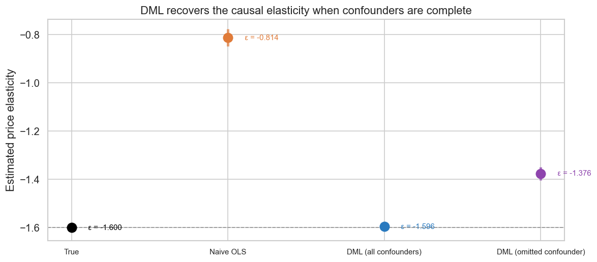 Unconfoundedness fails when an unmeasured variable jointly drives price and quantity after conditioning on \(W\). In practice this is the hardest condition to defend: if a merchandiser raises prices because she observes rising demand that is not captured in \(W\), the estimate is biased and no amount of ML flexibility fixes it. Overlap fails when a confounder stratum is deterministically associated with a single price — if your premium segment always sees $19.99, you learn nothing about its elasticity. Correct confounder specification fails in both directions: including a post-treatment variable like units sold biases the estimate; excluding a pre-treatment confounder like a competitor’s promotional calendar does the same.